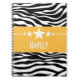 Trendy and modern Sassy Star Zebra Notebook featuring a chic black and white zebra print background and a bold yellow border adorned with a fun star motif. This girly design may be customised with the personalised text of your choosing. Click "Customise It" to find more personalisation options.