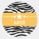 Trendy and modern Sassy Star Zebra Stickers featuring a chic black and white zebra print background and a bold yellow border adorned with a fun star motif. This girly design may be customised with the personalised text of your choosing. Click "Customise It" to find more personalisation options.