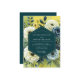 Experience a vibrant and artistic floral display set against a luminous chartreuse backdrop. This moody yet elegant design showcases lush ivory white roses contrasted with dramatic slate blue anemones and delicate foliage. The painterly style creates a rich, textured atmosphere perfect for a sophisticated union. Deep teal accents provide a bold and contemporary anchor to the composition.