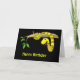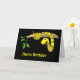 This reptile birthday card has a cute cartoon smiling snake image. It's yellow and brown and curled in a tree branch, with its head hanging down and its fangs out.