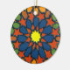 A colorful round ornament with a traditional Islamic pattern consisting of a yellow star, surrounded by geometric shapes in blue, orange, terracotta and green, all outlined in black. The design is from a screenprint by Judy Adamson.