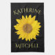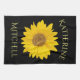 A close-up photograph of a single bright yellow sunflower and templates for first and last name on black background.
