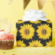 A pattern of bright yellow sunflowers on black background with a monogram letter in the centre of each flower.