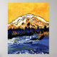 A painting of Mt Rainier with a bright yellow sunset.