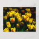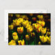 Tulip flowers of yellow and red colour on a flowerbed. Play of sunlight and dark green background. Tulips look like burning candles. Yellow tulip stands for hope, cheerfulness and bright and enigmatic smile.