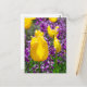 A bright yellow tulip against purple flowers makes for a vivid floral postcard.