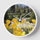 This round floral wall clock features a beautiful photo of yellow tulips and topiaries in a French garden from Arboretum Volčji Potok near Ljubljana, Slovenia.