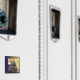One of three things yellow: looking through a window at a vase of tulips, three women in colourful dresses, and a muted rainbow over a background of yellow boxes.