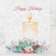 Festive red bow, a watercolor yellow candle, holly berries, fir twigs, and white flowers over white snowflakes background