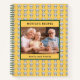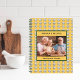 Personalise and add your own family photo. A yellow background decorated with a pattern of white chef hats.