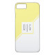 Yellow and white geometric iPhone 8/7 Case with monogram. The front includes two diagonal stripes one yellow and one white that separate the card in two triangles. A white square is on the centre with your monogram.
