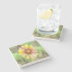 The coasters are gorgeous, a quality feel and heavy weight. They look like a precious archeological find. A rustic stone juxtaposed with a modern floral black and white print. I like the way the print goes slightly imperfect on the cut stone edges giving them a kind-of natural beauty.