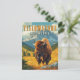 This retro-style travel postcard features a bold and colourful illustration of a Yellowstone bison. Set against a backdrop of mountains and a vibrant yellow stone background, this minimalist design captures the essence of the American West. Perfect for nature lovers and fans of vintage design.