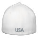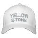 Hat shown in white with soft blue embroidered text: Yellowstone on the front and USA on the back.