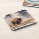 This plastic coaster set is shown with a photo print of a bison standing by a geyser in the famous Yellowstone National Park.