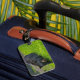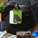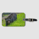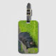 This luggage tag is shown with a photo print of a wild black bear in Yellowstone National Park.