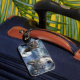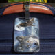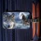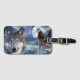 This luggage tag is shown with a photo print of a wild wolf in Yellowstone.