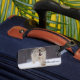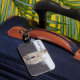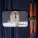 This luggage tag is shown with a photo print of a wild wolf in Yellowstone.