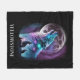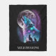 This cosy fleece blanket is shown in a lovely Yellowstone wolf print on a black colour background.