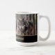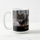 This ceramic coffee mug is shown with a photo print of wild wolves in Yellowstone National Park.