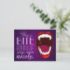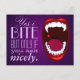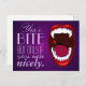 Creepy campy horror show type art, vampire teeth, demon or monster fangs, a shlock horror comic book style drawing of a wide open mouth with bright white sharp elongated canine teeth, a red drop of blood, red lips, deep purple gradient background and pale purple text. A taste of vampire humour with elegant fun fonts. You can use the customise feature to change style, size or colour of font if desired. This postcard is great sent as a chuckle between friends or hung as wall art, for vampires, dark lords and ladies and other blood-thirsty creatures of the night.