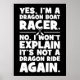 This humourous design features a strong and attention-grabbing phrase: "Yes, I’m a Dragon Boat Racer. No, I Won’t Explain It’s Not a Dragon Ride Again." Combining bold typography with paddles as a visual element, it perfectly blends humour, pride, and passion for dragon boat racing. A must-have for paddlers who are tired of explaining the sport and want to wear their dedication with pride. A bold and witty design that humorously clears up a common misconception about dragon boat racing. The phrase, "Yes, I’m a Dragon Boat Racer. No, I Won’t Explain It’s Not a Dragon Ride Again," delivers a mix of pride and playful sarcasm, perfect for paddlers. Ideal for dragon boat enthusiasts, racers, and teams who are constantly asked about their sport. This design is a fun way to showcase passion for the sport while shutting down repetitive questions with style.