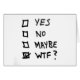 The words,"Yes," "No," "Maybe," and "WTF?" with check boxes next o them.  The words are written in black magic marker on a white background. Makes a great gift!