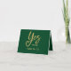 This elegant emerald green and gold wedding design features the phrase “Yes we do!” with the word “Yes” written in a romantic gold script — the sweeping Y cleverly incorporates a heart shape, symbolising love and unity. The minimal chic layout combines bold modern typography with timeless gold accents, creating a luxurious look perfect for formal events, emerald green tie celebrations, or evening weddings. The names are displayed in graceful calligraphy, adding a touch of personal charm to this sophisticated stationery.