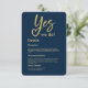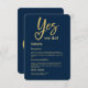 This elegant navy blue and gold wedding design features the phrase “Yes we do!” with the word “Yes” written in a romantic gold script — the sweeping Y cleverly incorporates a heart shape, symbolising love and unity. The minimal chic layout combines bold modern typography with timeless gold accents, creating a luxurious look perfect for formal events, navy blue tie celebrations, or evening weddings. The names are displayed in graceful calligraphy, adding a touch of personal charm to this sophisticated stationery.