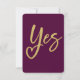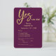This elegant plum and gold wedding design features the phrase “Yes we do!” with the word “Yes” written in a romantic gold script — the sweeping Y cleverly incorporates a heart shape, symbolising love and unity. The minimal chic layout combines bold modern typography with timeless gold accents, creating a luxurious look perfect for formal events, plum tie celebrations, or evening weddings. The names are displayed in graceful calligraphy, adding a touch of personal charm to this sophisticated stationery.