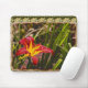 A slightly vintage looking photograph of a red and yellow day lily with drops of water on the petals and leaves.