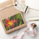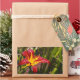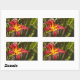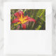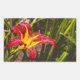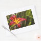 A slightly vintage looking photograph of a red and yellow day lily with drops of water on the petals and leaves.