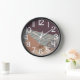 This wall clock has a mid-century modern abstract design of a blue line, a tan triangle, and a brown circle made of dots on a field of dark eggplant and cream. If you want the same design with different colours, message me.