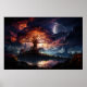A colourful artwork of the tree, Yggdrasil, illuminated from within, sitting on a hill that overlooks a body of water, in which it is reflected., and on which people are gathered. The tree is bathed in reds, oranges, and yellows. Behind the tree is either a city or some rock formations, blanketed by mist. The sky is full of angry red clouds, through which peeks the heavens, in blue and purple, with a large grey moon hanging off centre to the right.