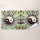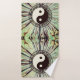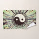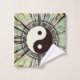 A dazzling trippy prism like pattern of greens and browns showcasing the ancient harmonising yin yang symbol with a decorative Greek stencil border. Zen boho spiritual vibes
