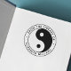 From the library of or this book belongs to rubber stamp with a yin yang symbol in the centre and your custom text and name in a modern sans-serif font.