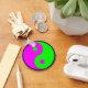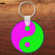 Yin Yang Keychain. This keychain is decorated with a magenta and green Yin Yang symbol. "In Taoist philosophy, yin and yang arise together from an initial quiescence or emptiness and continue moving in tandem until quiescence is reached again. For instance, dropping a stone in a calm pool of water will simultaneously raise waves and lower troughs between them, and this alternation of high and low points in the water will radiate outward until the movement dissipates and the pool is calm once more. Yin–yang, thus, are always opposite and equal qualities. Further, whenever one quality reaches its peak it will naturally begin to transform into the opposite quality: grain that reaches its full height in summer (fully yang) will produce seeds and die back in winter (fully yin) in an endless cycle" - Wikipedia. A great gift idea.