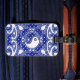 Classic chinese symbolisation of balance and harmony between opposites set against a royal blue and white background with a teal outline.