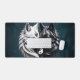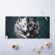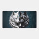 Yin Yang Wolves. The image features a white wolf and a black wolf, their heads facing each other in a close-up shot. The white wolf has blue eyes and a golden ornament with a blue gem on its forehead, while the black wolf has yellow eyes and a similar ornament. The wolves are positioned against a dark blue background with a white yin yang symbol between them.