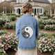 This denim jacket features a zen art style, black and white yin Yang illustration.