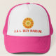 Kid`s Trucker Hat pink with white front red and gold circle with smiling sunshine (with slightly darker face) in the centre and "MAXANNA GLOW A.K.A. SUZY SUNSHINE". This design is all about fun. Smile and the whole world smiles with you.