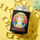 Colourful illustration with "Nameowste" text design and cute Kawaii cat is doing yoga on colourful striped retro background