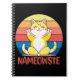 Colourful illustration with "Nameowste" text design and cute Kawaii cat is doing yoga on colourful striped retro background
