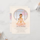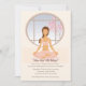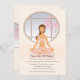 Serene and relaxed a young female sits in a yoga position. Behind her a large picture window with a view of a blooming tree. A delightful invitation for a birthday party or any yoga event.