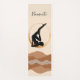 Namaste. Black silhouette yoga pose on a gold crescent moon above a modern abstract neutral mountains background. Black text in a modern handwritten font says Namaste or it can be personalised with your own text.