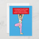 A cartoon lady standing in a yoga pose, holding up a red sign that says 'Congratulations on graduating from yoga school'. The image has a sky blue coloured background.
