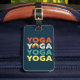 Retro style grunge colourful "Yoga, Yoga, Yoga, Yoga" text design with a girl in yoga pose on colourful striped retro style background decoration