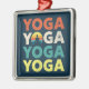 Retro style grunge colourful "Yoga, Yoga, Yoga, Yoga" text design with a girl in yoga pose on colourful striped retro style background decoration