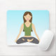 Stylish vector illustration of a beautiful brunette woman doing yoga. The woman is sitting in traditional lotus position. She is wearing a green tank top and dark grey pants. The background is a lovely blue gradient.