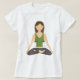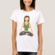 This shirt features a stylish vector illustration of a beautiful brunette woman doing yoga. The woman is sitting in traditional lotus position. She is wearing a green tank top and dark grey pants.